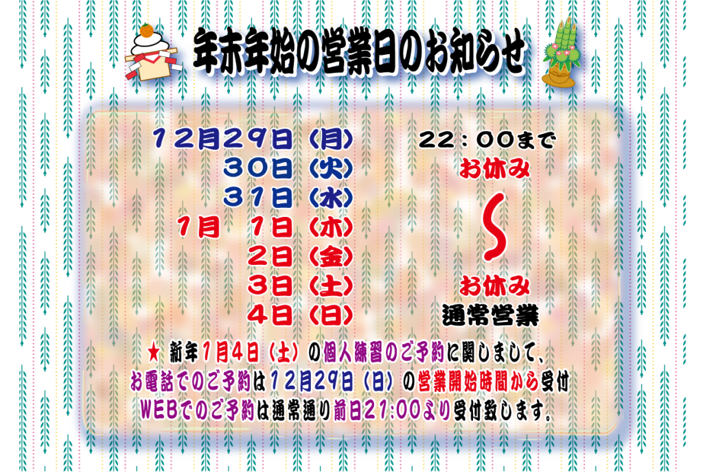 ・新年1月4日(日)の個人練習のご予約に関しまして